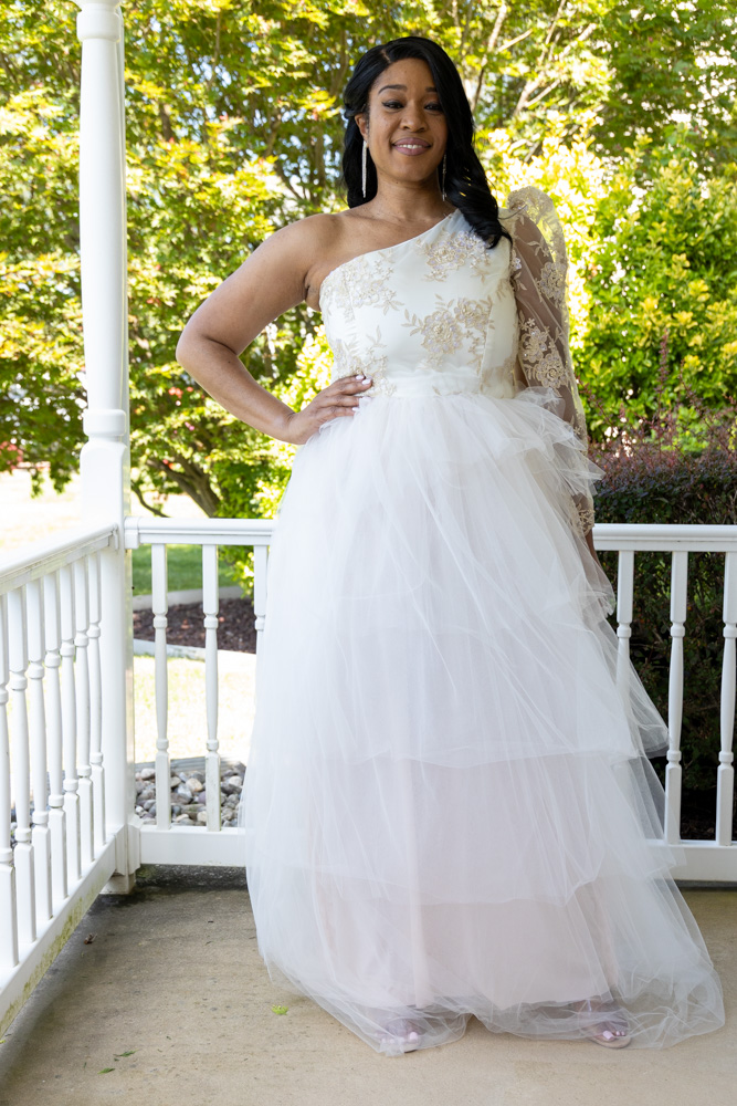 One sleeve beaded lace champagne gown has fitted bodice, tulle layer skirt, side zipper fully lined. Sizes Xs-5Xl. Fits cup sizes up to DDD